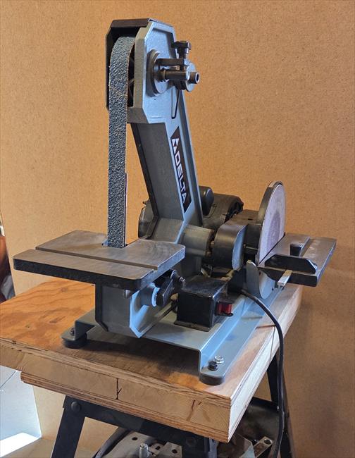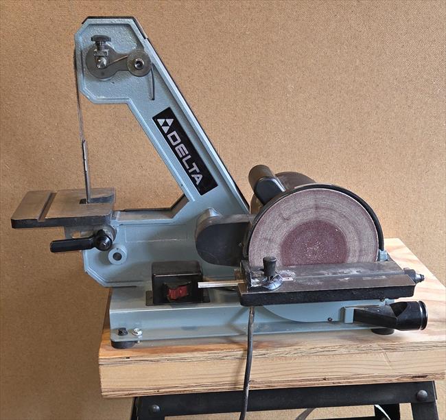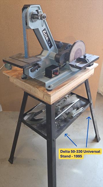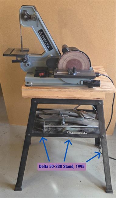 Purchased this Delta 1" Belt / 8" Disc Sander in 1995. Bolted it to wooden top, on top of the Delta Model 50-330 Universal Stand. I have found this in Delta Catalogs from 1991 to 2000. Since 2000 I have seen this exact frame and model of a sander sold under other manufactures names. Not sure of the full history. I could not find an info plate on the sander, only the plate for the motor.