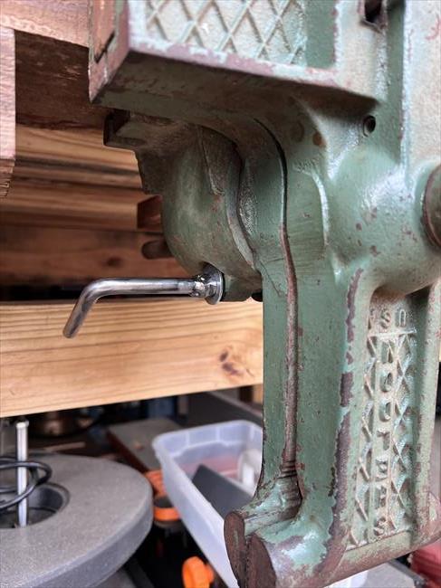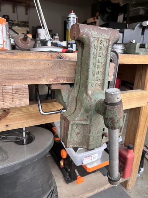 My wife and I won this vise at Arnfest South's raffle 4/11/2026. I don't have the name of the previous owner. It still needs cleaning up at this point and need a turret locking bolt. I made a bolt for it and tested it out. I found a video of the same vise on Youtube and copied that locking bolt. the locking bolt is 8 inches total length bent at 90 degrees at about 3 1/2 inches, with about 1 inch of 3/8 x16 thread. I drilled out a 3/8 inch nut at 25/64th so it would slid over the threads and I could weld it on the rod at about 1 7/8 inches from the bottom of the threads. The vise fully opens up to 7 1/2 inches from what I can determine at this point. Here is a link to the vice as it works now with the fabricated bolt. https://www.youtube.com/shorts/QlTFbiAeSeE