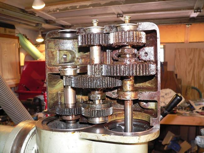 The gears exposed, rear shaft is from the motor, front is to the spindle
