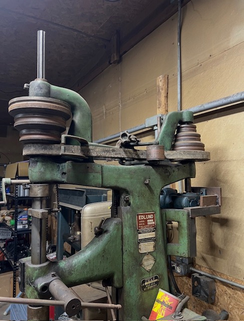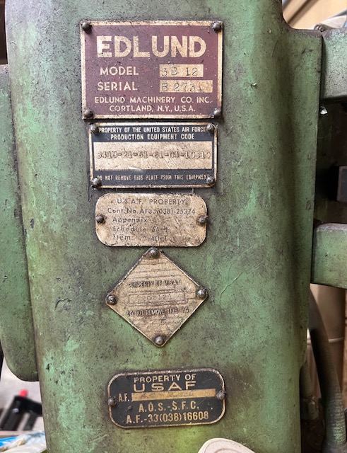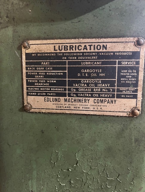 The lubrication label says "Edlund Machinery Company / Division of Bradley Edlund Corporation" which dates the machine to between 1949 and 1952.